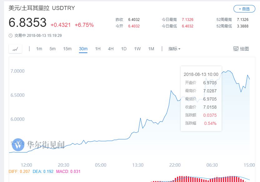 等一等,土耳其现在不仅没有浪漫,该国货币还被美国打得喘不过气来,面临崩盘。周一(13日),土耳其里拉兑美元汇率再度暴跌,首次跌破7关口。